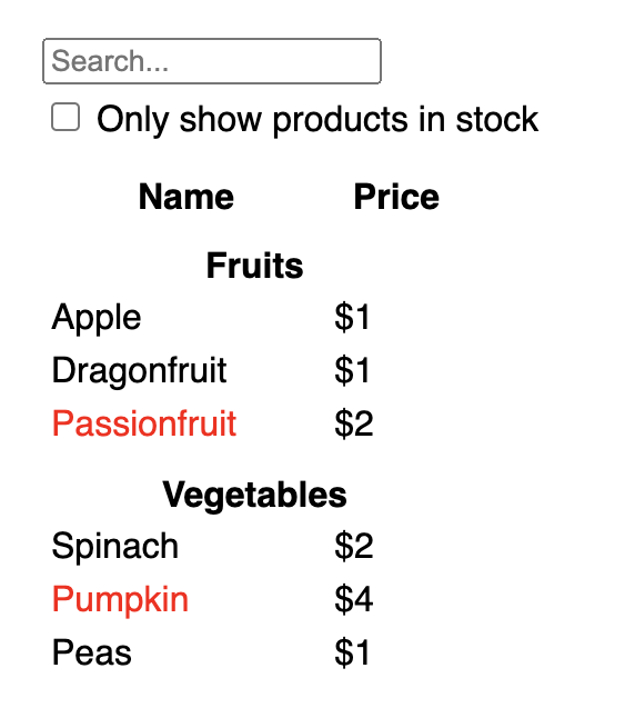 Man kann entweder “von oben nach unten” bauen, indem man mit den Komponenten beginnt, die in der Hierarchie weiter oben stehen (wie FilterableProductTable), oder “von unten nach oben”, indem man mit Komponenten arbeitet, die weiter unten stehen (wie ProductRow). Bei einfacheren Beispielen ist es in der Regel einfacher von oben nach unten vorzugehen, und bei größeren Projekten ist es einfacher von unten nach oben vorzugehen.